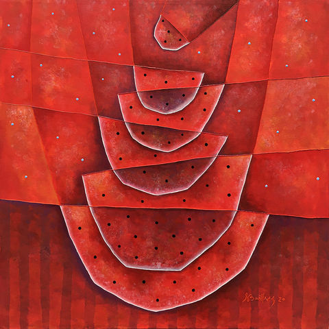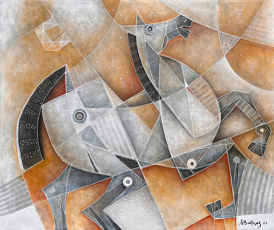 His themes convey the joy of life with surrealist, impressionist, and cubist touches. “In my works, I aim to express everything from the joy and bravery of a bull in the ring to the soft and gentle lull of sea waves, always featuring dynamic centers that showcase a unique mastery of line, form, and color.”